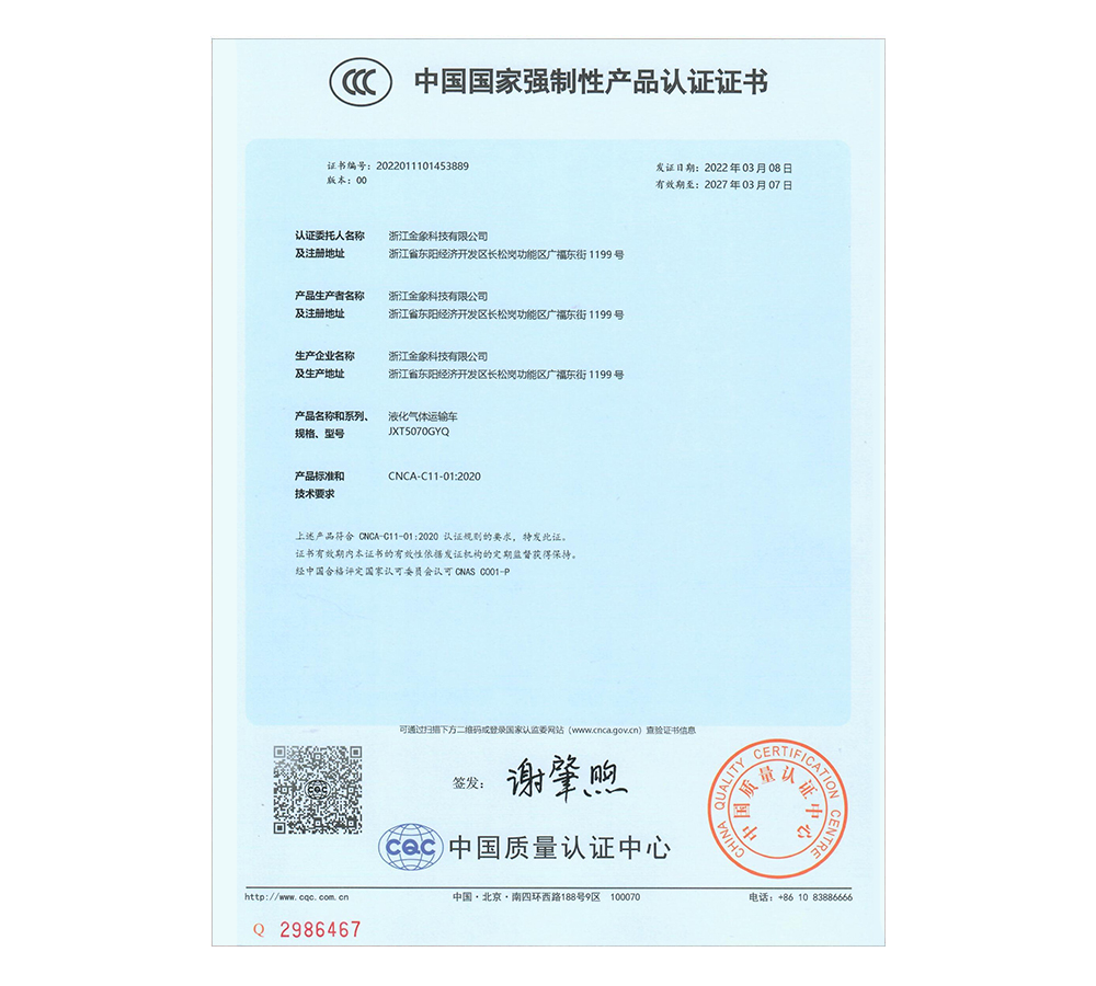 液化氣體運(yùn)輸車-JXT5070GYQ--CCC認(rèn)證證書(2022-2027)-5m3